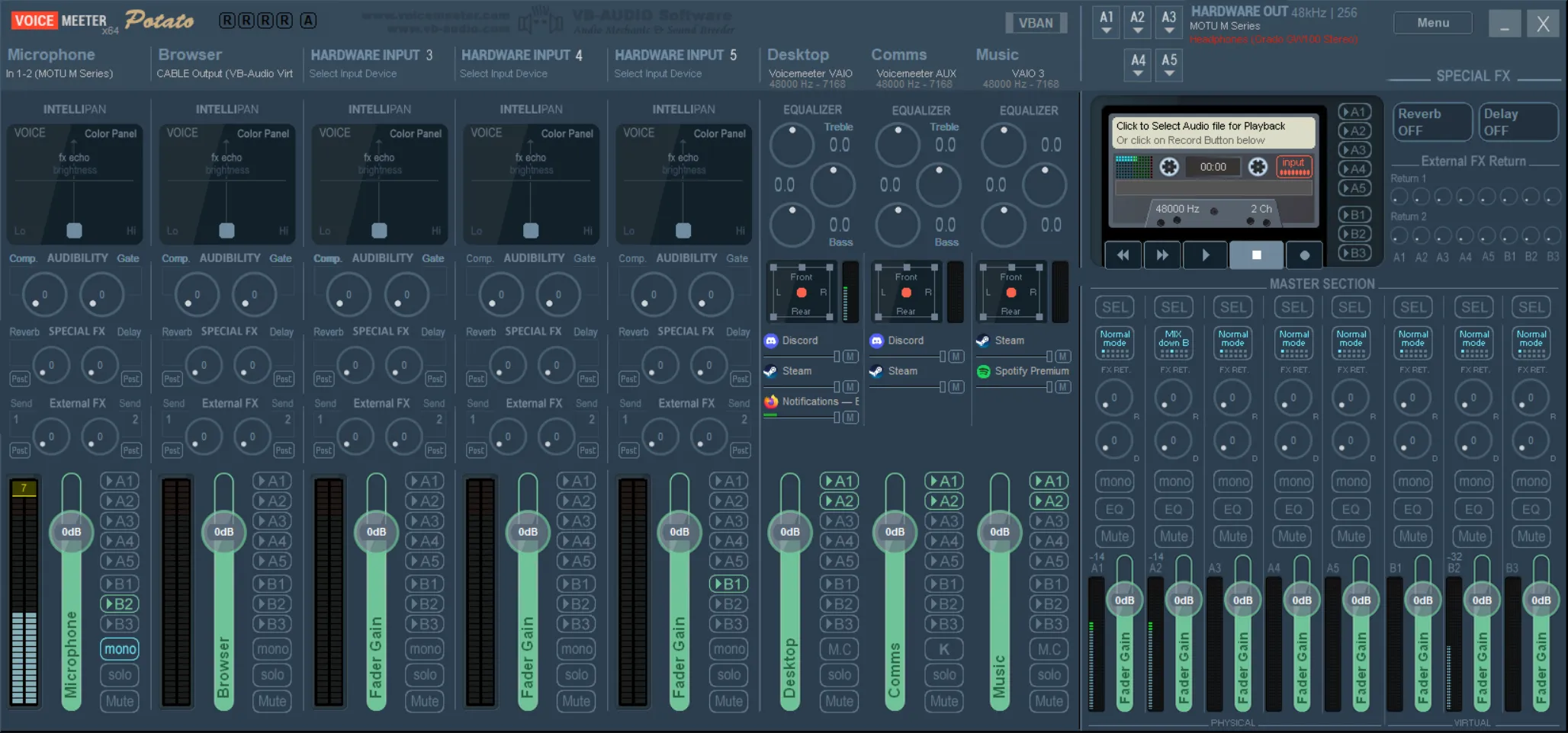 Right now I have everything at defaults, but I usually have some EQ settings on the right, and for fun I mess with the “Intellipan” above my mic input on the left.
